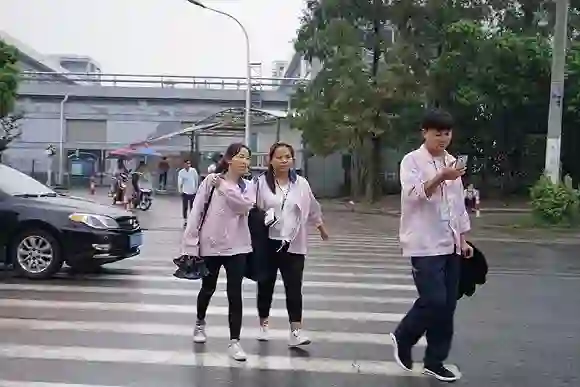 身着工服,从厂区鱼贯而出的青年。摄影:杨舒鸿吉