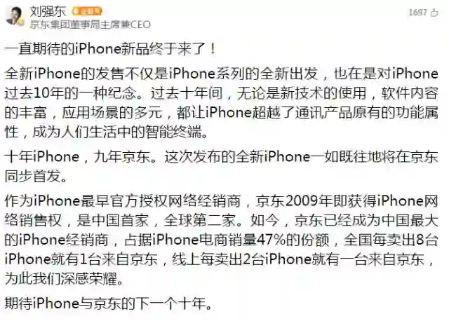 刘强东发文称,全新iPhone的发售不仅是iPhone系列的全新出发,也是对iPhone过去10年的一种纪念。当然,重点是:十年iPhone,九年京东。这次发布的全新iPhone一如既往地将在京东同步首发。