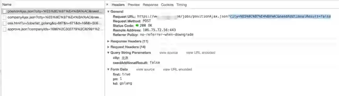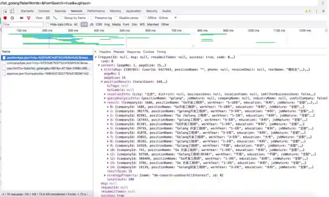 搜索 golang 关键字,打开页面 F12 就能看到它发送了四个请求,留意 positionAjax.json 这个请求:
