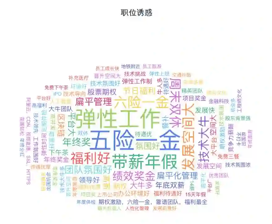 职位诱惑是投简历时必看的一点了,可以看到高频词条基本都是 IT 从业者关心的话题了,这里你懂的...