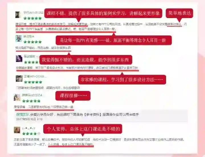 1、内容超丰富:从0到1,图片、文字、形状、配色、图表、版式、动画样样精通,更多小技巧,即使不跟着练,听一遍也让你收获满满!
