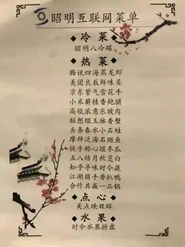 这菜谱,腾讯系的名字都在里面了,最后还颇有寓意地说“合作共赢一品锅”