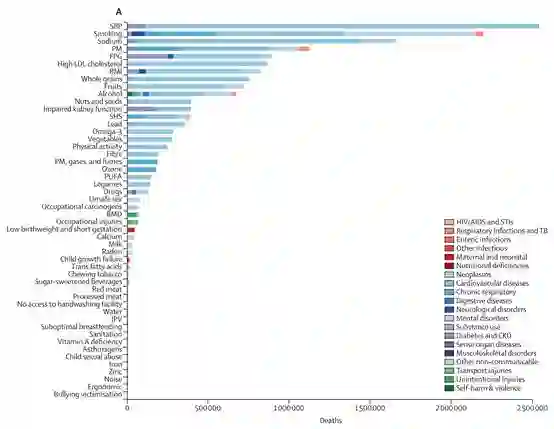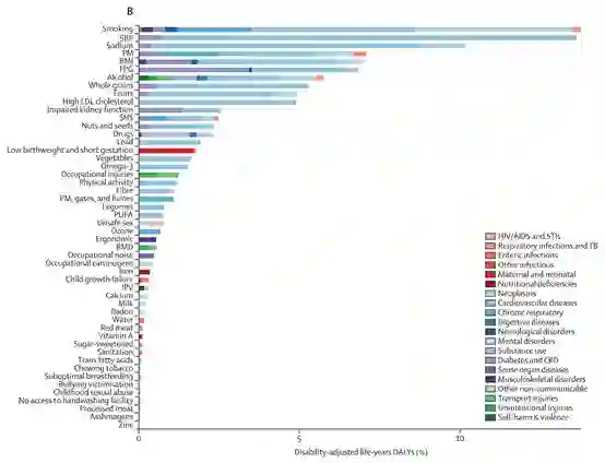 研究人员发现,不论是直接导致死亡(Death)还是增加患者的疾病负担(即DALY),高血压、吸烟、高盐饮食和空气污染及其引发的疾病均是主要的危险因素(图7)。