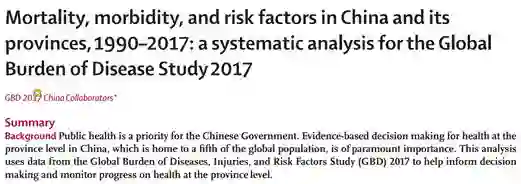 [1]GBD 2017 China Collaborators, Mortality, morbidity, and risk factors in China and its provinces,1990-2017: a systematic analysis for the Global Burden of Disease Study 2017. The Lancet, (2019). DOI:https://doi.org/10.1016/S0140-6736(19)30427-1