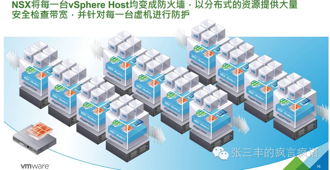 特别有意思的是峰会也请到VMware讲了一个关于“微分段”的议题。跑在Hypervisor层的防火墙解决了host主机性能消耗的问题,面向虚拟机名称/标签的策略定义可以有别于传统基于网络IP地址来进行更丰富的分段策略。也避免了臃肿的防火墙策略管理。