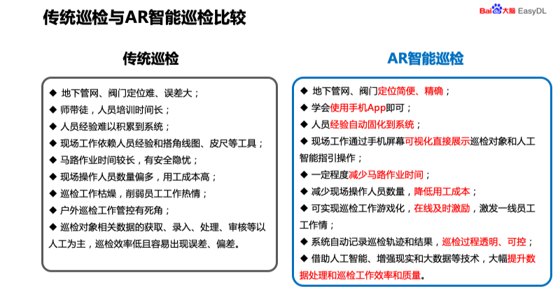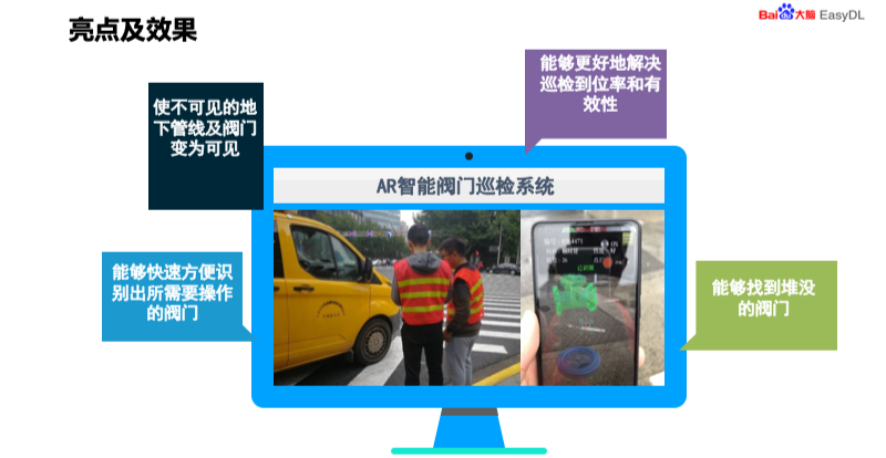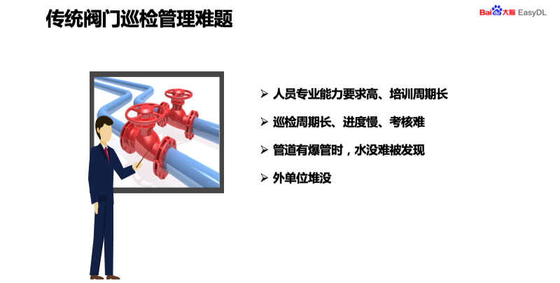这款产品与传统的巡检进行了比较,从以下几个方面。传统的巡检地下管网和阀门定位难、误差大,利用 EasyDL 智能巡检,地下管网和阀门定位简便而且准确。第二就是存在着师傅带徒弟,人员培训时间长,我们的产品只要学会手机的 APP 使用即可,门槛非常低,即使是刚入职的员工也可以经过一个礼拜左右的培训,就可以完成培训任务。