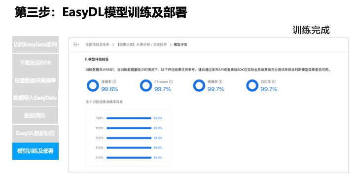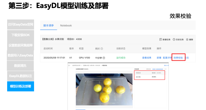 可以查看一下这个效果,也是这个水果模型,用了 5000 张图片,可以看一下效果,这不是非常大的规模,但是训练效果已经相当好了,因为数据是规范的原因,EasyData 接入的数据就是标准,以及质量经过清洗后的,质量很高,没有用很大的数据量,当然后面还可以提升,现在准确率是 99.6%。