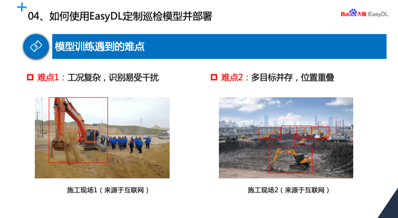 在我们的模型训练过程当中碰到的问题主要是两方面,一是现场的工况复杂,识别容易受到干扰。第二个就是很多施工现场目标是多个目标,位置也是重叠的,比如我这张图片当中的挖掘机有好几个,这种情况给我们的识别带来了比较大的难度。