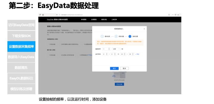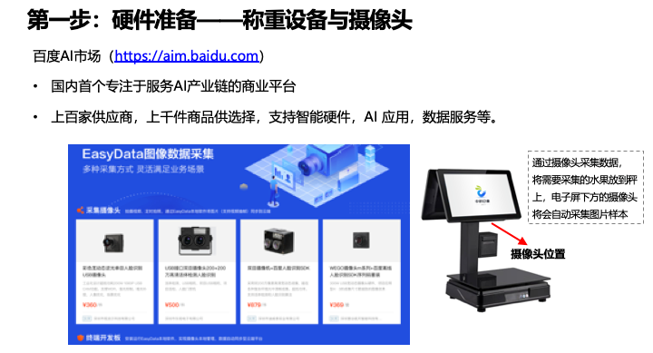 这个图展示了从硬件到准备部署的全流程。首先准备一个秤和摄像头,访问 EasyData 入口,一直到最后的模型部署的训练。接下来会走到实操的环节,我会在页面上给大家演示一下整个 EasyData 的数据接入到训练部署的流程。