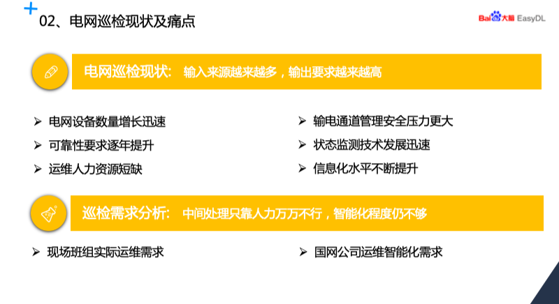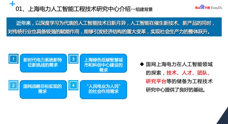 今天我介绍分三部分,首先介绍上海电力人工智能工程技术研究中心的情况,然后再分析电网巡检的现状及痛点,最后介绍如何使用 EasyDL 定制电网巡检模型并部署。