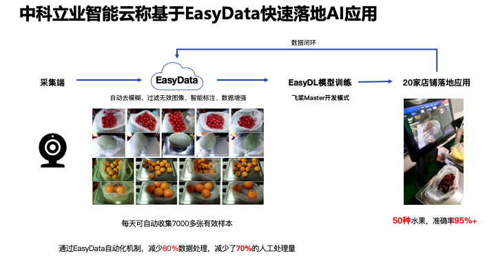 第一部分对于 EasyData 的介绍我已经简单快速地介绍了,下面开始我们结合 EasyData 对一个果蔬识别模型训练和部署实战的演示。这个例子是中科立业智能云秤结合 AI 的 EasyData 快速落地,使用 EasyData 进行数据生产,模型训练,然后将模型功能用到智能云秤上,目前识别出 50 种水果,识别率达到 95% 以上,随着对模型继续迭代,准确率还可以继续提升。