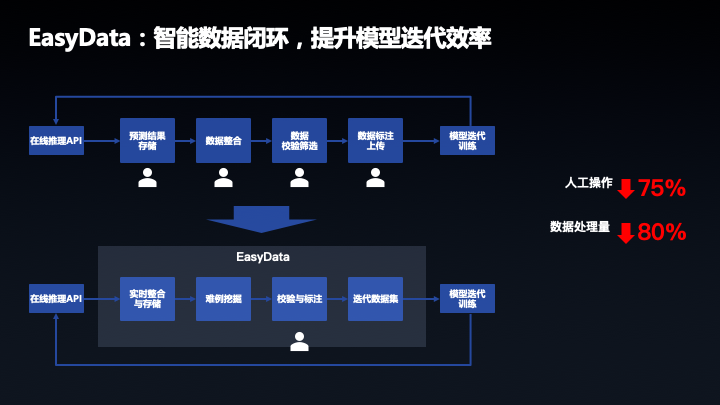 智能化还体现了标注环节,EasyData 提供了智能标注的功能,针对图像数据只需要标注大约 30%,就可以使模型效果和全量数据效果模型一致。大概原理就是先标注少量数据,然后智能标注再进行模型的预训练,训练完以后会有一些不确定的示例再次确定,需要用户参与确认,经过几轮迭代,模型的准确率就会变高,智能标注就会完成标注,整体可以减少 70% 的标注量。