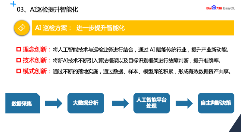 首先理念上我们将 AI 技术与传统的巡检业务结合,能够将 AI 赋能传统电网巡检,提升产业动能。第二方面,是技术上有创新,我们将 AI 技术不断引入算法框架以及目标识别框架进行故障判断,能够大幅度提升判断的准确率。第三块变化就是模式的创新,通过不断的落地实施,通过数据、样本和模型库的积累,能够形成一个有效的数据资产的共享。