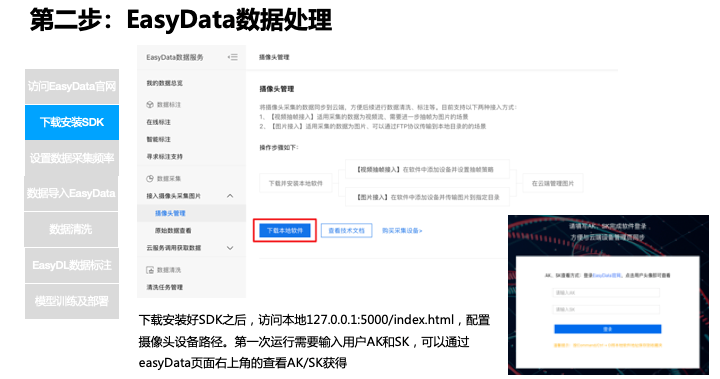 现在可以看到,这是 EasyData 的管理平台,左侧是功能,几大块数据总览,下面是标注,有在线标注,智能标注,还有标注的支持,如果你是标注的新手,可以提交给我们寻求一些支持。这块是摄像头采集图片,也就是一会要做的,在这里下载 SDK 把我们的摄像头部署好,还有一个云服务获取数据,这个最后再讲。最下方是清洗任务的管理。