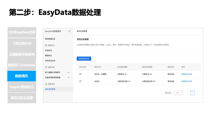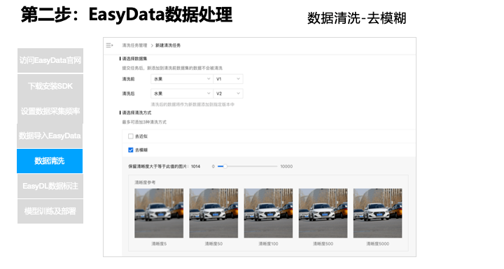 清洗环节也需要手动完成数据清洗,如一些简单的数据清洗还好一点,如果图片模糊相似这种,需要更大的力气花一番时间调研和开发,而在 EasyData 上我们首先向用户灌输在数据生产环节需要近来专业规范操作,专业化的数据生产,加上科学的深度学习算法以及可接受的算力成本,才可以训练出实际解决场景的模型。