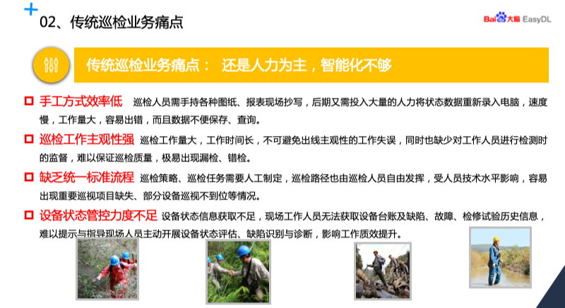 传统的电网巡检我们分析一下它的痛点,它的问题主要是呈现在四个方面,一是手工方式效率比较低。二就是巡检的主观性比较强。第三个问题就是缺乏统一标准流程。第四个方面是设备的状态管控力度不够。刚才的暖场片里大家也看到了一些场景,反映了我电网巡检的一些正常的作业方式,也就是说还是依靠大量的人力投入来实现巡检的。PPT 上有几张简单的图可以看出来,在某些场景巡检是非常辛苦的工作。