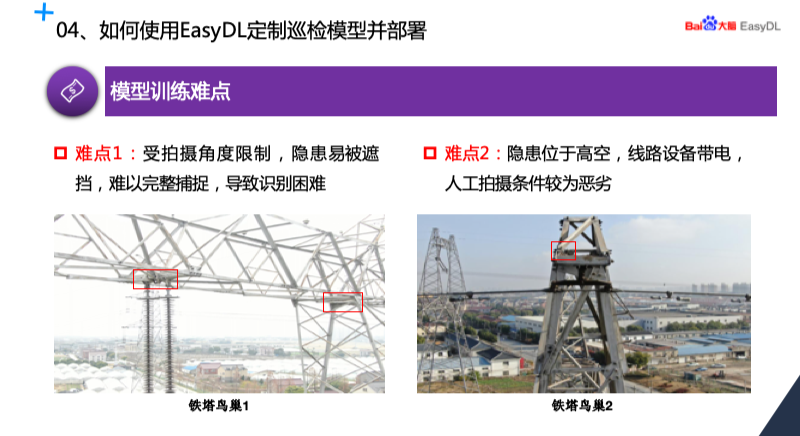 在我们的训练过程当中,我们总结了一下难点主要有两块,第一就是受拍摄角度的限制,鸟巢的位置往往容易被输电构架遮挡,难以完整捕捉到非常清晰的鸟巢,因此识别比较困难。第二个难点,因为鸟巢都处在高空,因此人工拍摄的条件比较恶劣,我们更多的时候是依靠无人机拍摄。