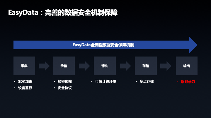 最后讲一下大家都比较关心的数据安全,数据安全这个点在 EasyData 设计之初就已经考虑到了,全流程环节中保证了数据的安全,如采集端的数据鉴权,加密输出,后续 EasyData 会考虑引入联邦学习的方式,做到数据不出安全区而用于深度学习的模型训练。