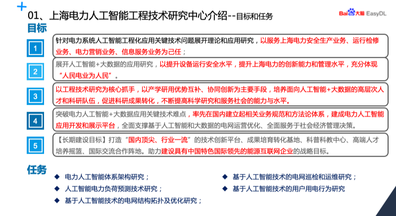 长期建设目标,打造“国内顶尖、行业一流”的技术创新平台、成果培育转化基地、科普科教中心、高端人才培养摇篮、国际交流合作阵地。助力建设具有中国特色国际领先的能源互联网企业的战略目标。结合上海电网具体实际,工程研究中心制定了五方面的任务,主要包括电力人工智能体系架构的研究,人工智能电力负荷预测技术研究,电网巡检研究,结构拓扑和运维研究。