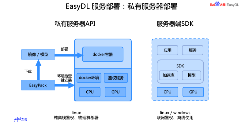接下来会对刚才说到的几个离线场景的部署方式进行简单的介绍。私有服务器部署有两种方式,一种是刚提到的私有服务器 API,用户在本地服务器部署和云端一致的 API 服务,这个是我们用了百度的 Easy Pack 工具,是一键部署工具,会对机器的硬件环境检查,看是否适合安装,比如 Docker 环境,还有鉴权服务,然后部署一个 Docker 容器,访问容器中的服务和云端的 API 两种服务。