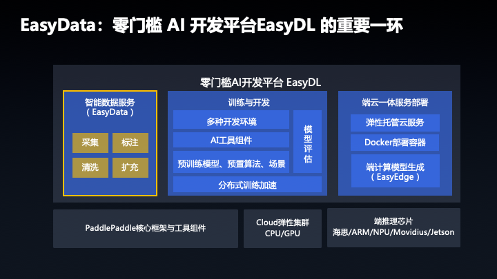 下面看一下它大概的结构,首先说一下为什么要推出 EasyData 这款产品。主要有三点,大家可能都知道,AI=数据+算法+算力,百度 EasyData 一站式开发平台在算法和算力和部署上做了很多工作,有 EasyData 经典版和专业版,虽然支持了部分数据的功能,像现在一些数据已经上传,但是不是很系统,所以我们针对数据进行了梳理,推出了 EasyData 智能数据服务平台。