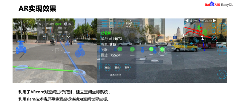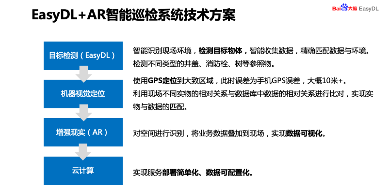 下面我介绍一下系统的技术方案,EasyDL+AR 的方案。首先是进行了目标检测,这里运用了 EasyDL,后面还要进行详细的介绍,主要是通过智能识别现场环境,检测目标物体,智能手机数据,这里检测的物体就是井盖、消防栓、树等参照物,将 EasyDL 检测到的物体的像素坐标转换为世界坐标,通过机器视觉进行定位。