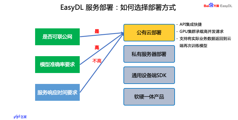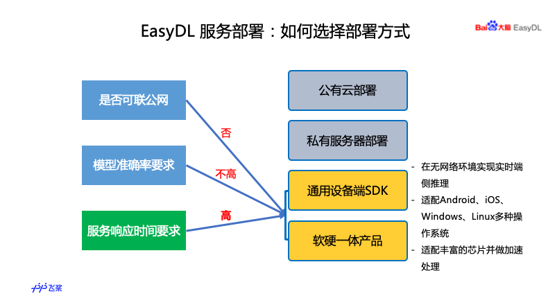 这边有两种方案,一种是设备端 SDK,能满足手机和嵌入式设备的应用。如果大家对硬件没有选型的时候,用 EasyDL 的产品还没有做硬件选型,推荐大家考虑 EasyDL 的软硬一体产品,EasyDL 有专门的优化,同时服务部署的时候,我们能够快速的定位,可以帮大家解决问题。