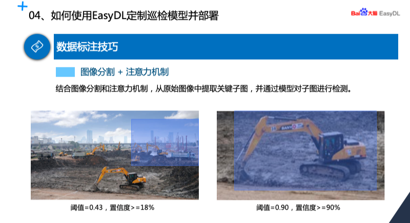 这里我们举个例子,比如前面看到的大型施工现场图,挖掘机有好几台,识别的过程当中第一次只识别到右上角这一台挖掘机,最前面这台没有识别到,后来我们把图片处理了一下,采用了图像分割+注意力机制的方式,把最前面那台挖掘机单独提取出来,然后它就很容易的识别出来了。