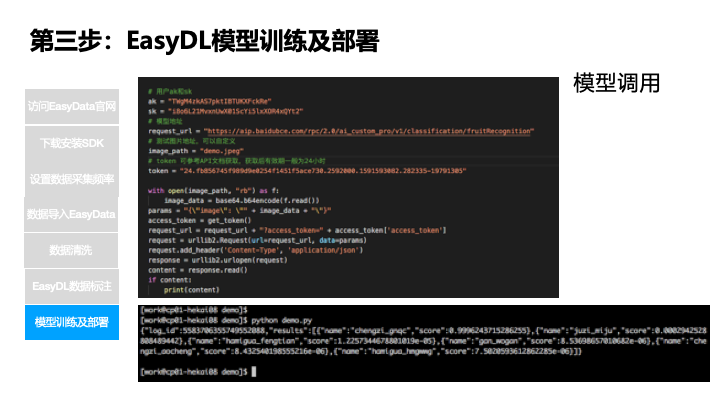 第三步就是数据的标准和上传,考虑到数据的可持续应用,采用了本地标注,通过接口批量接口上传到 EasyDL,EasyDL 也提供了在线标注,标注的数据存在百度大脑这边,本地就没有。第四就是模型训练,我们采用了经典版和专业版进行了物体检测训练,经典版比较容易操作,适用于小白,不懂算法的,经过一天的学习可以很方便的使用。