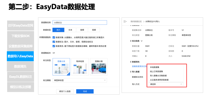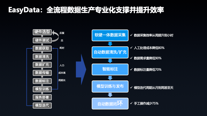 在实际生产数据环节,EasyData 帮用户做了线下很多琐碎的工作,如硬件选型和调试,EasyData 推出软硬一体方案,在 EasyData 下载软件,安装即可使用,数据清洗环节,后续会推出对应的功能。智能标注,目前已经提供了单人在线标注和多人标注,后续会上线多人智能标注,EasyData 让 AI 更简单,更专业。