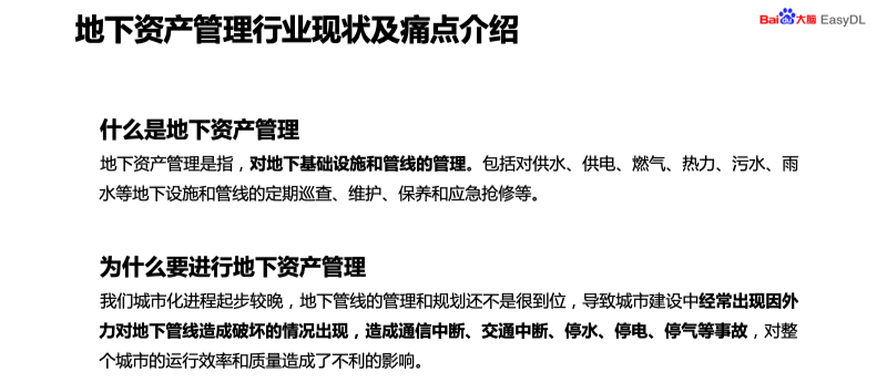 主要分两个方面进行介绍,第一是地下资产管理的现状以及痛点介绍。第二是如何使用 EasyDL+AR 进行地下资产管理。