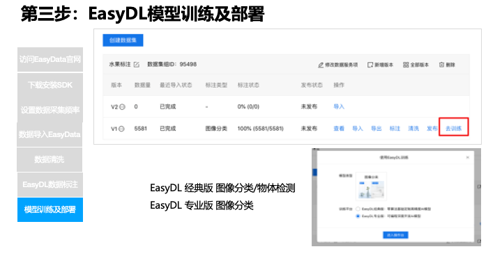 下面用一个备用的数据集,可以看一下标注的功能,这边有一个备用的数据集,点击标注,现在没有标注的图还有 1 张是橘子,这是已经标注的数据,我添加搜索标签,因为这是一个橘子,标签搜橘子,有这个标签就点击 OK,标注结果是橘子,点下一步,自动保存,现在所有都已经标注完成,我们可以回到数据总览。到这一步是 EasyData 的完成了,下面是 EasyDL,这里选择一个专业版。