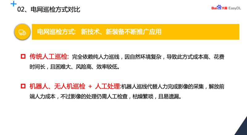 新技术新装备也使我们的电网巡检方式在逐步转变,由传统的人工巡检,完全依赖人力巡线,逐步向依靠机器人无人机巡检+人工处理方式转变,这种方式虽然机器人和无人巡检能够解放前端的人力成本,但影像处理还需要大量的人力做检查,这个工作还是有待提高的。因此,AI 的巡检方向为我们提供了一个新的路径。