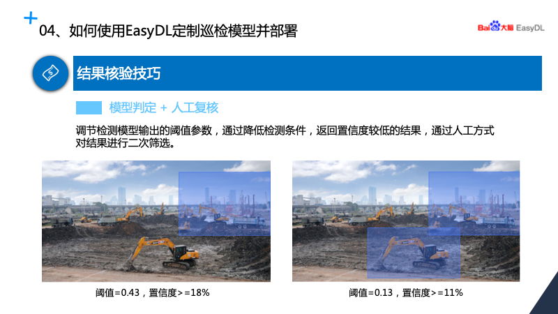 经过校核我们输出的阈值参数也可以通过降低阈值来提升,同时结合人工检验进行二次筛选,模型判定+人工复核的方式能大大提升我们的识别率。经过检测我们所输出图片的准确率跟精准率都能达到 100%,效果还是非常好的,整个过程使用起来也是非常方便易用。