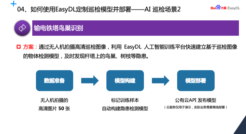 第二个场景首先通过搜集输电铁塔鸟巢的图像,我们搜集了 50 张比较清晰的照片,这些照片有电力巡检过程当中的照片,更多的是互联网上找到的,我们将这些照片利用 EasyDL 建立基于巡检图像的物体检测模型,然后进行训练,最后将训练的模型部署在 API 上。