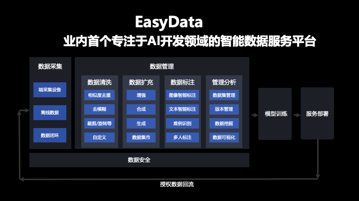 这是 EasyData 的整体业务架构图,在数据采集、数据扩充、数据清洗、数据标注、数据管理分析等数据生产过程中做了比较专业规范的工作,而且会在这些方向上持续提供能够给用户解决实际问题的功能。