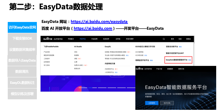 首先打开 EasyDL 的官网,然后在开发平台,EasyDL,我们选择专业版进行演示。进入这里,整个过程会有三个步骤,第一步是数据准备,然后再进行模型训练,训练完了以后再进行模型的部署。