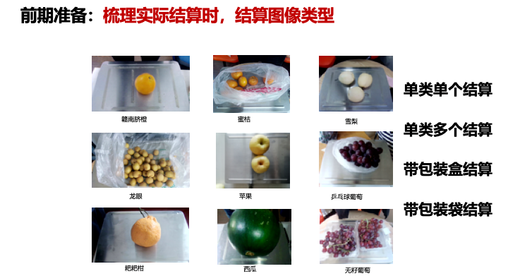 第二个问题,可以看到图片上有一些水果是被塑料袋包裹的,因为结算时候可能把塑料袋直接去秤,我们需要对包裹水果的识别率。还有一个问题,有些水果它是一个拉类,比如橙子、橘子、葡萄,可能彼此之间非常相似,这也需要一些数据增强,以及对数据的调整,达到训练的效果。