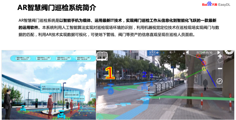 介绍一下 EasyDL 智慧阀门巡检系统。AR 智慧阀门巡检系统是以智能手机为载体、运用最新 IT 技术,实现阀门巡检工作从信息化到智能化飞跃的一款最新的运用软件。