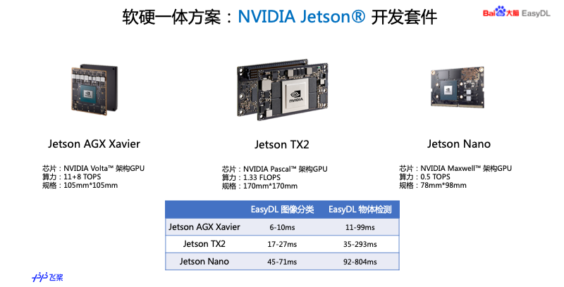 第三种方式是通用设备端的 SDK,这个是面新手机和嵌入式硬件设备,可以把 SDK 集成到手机 APP 或者宿主机,广泛支持不同硬件和操作系统,针对各种芯片也做了加速。还有我们提供的软硬一体产品,这个是把性能的方案和专项适配的 SDK 相结合,提供了多种方案可选择,包括百度自研的 EdgeBoard 系列,还有 EasyDL-NVIDIA Jetson 系列。