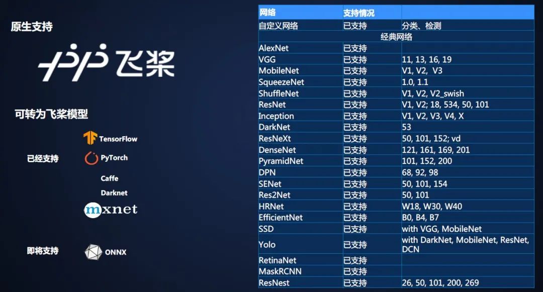 如图,EasyEdge支持主流的深度学习框架、部分网络,后续大家可以在EasyDL官网上了解更多信息。