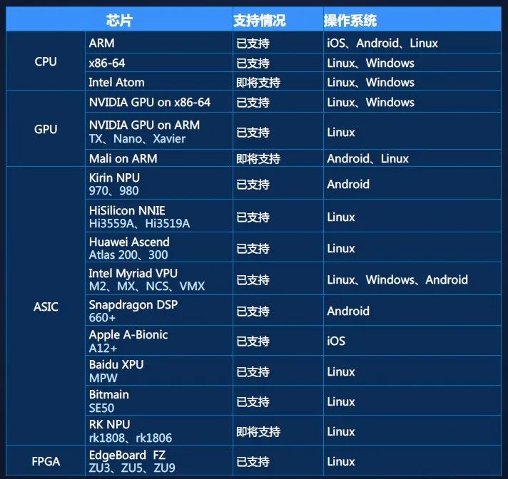 EasyDL-EasyEdge已支持10余类芯片、4大操作系统: