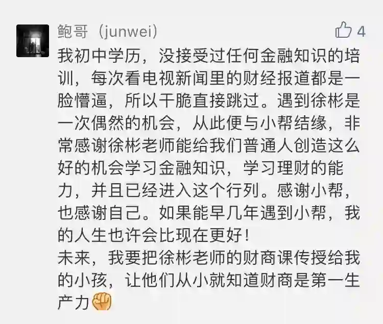 徐彬老师带领的小帮团队已帮助超10000家庭完成了家庭理财规划,他们的原创课程在全网超20万学员受益。