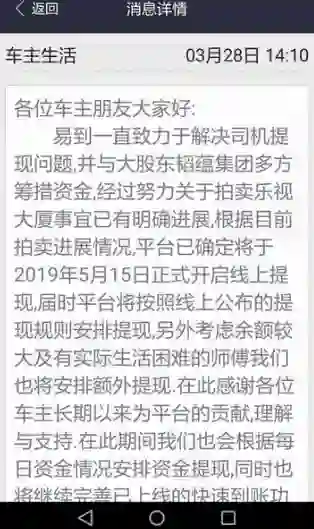 而在3月28日易到曾向车主发出通知,称易到大股东韬蕴集团已在多方筹措资金,目前拍卖乐视大厦事宜已有明确进展。根据拍卖进展情况,平台已确定将在2019年5月15日正式开启线上提现。同时,通知提到了易到的快速到账功能,也将于近期上线。