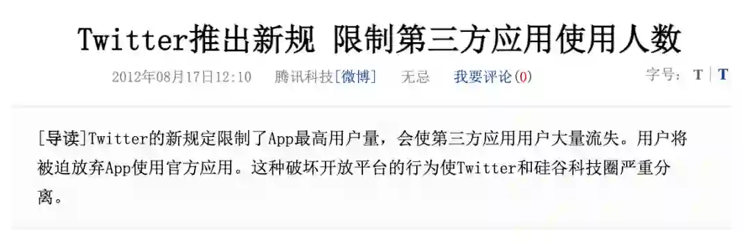 2010年,Facebook屏蔽了推特的“查找好友”接口,推特指责Facebook“拒绝开放,违背互联网精神”;2012年,推特自己屏蔽了所有用户数超过10万的第三方应用接口。