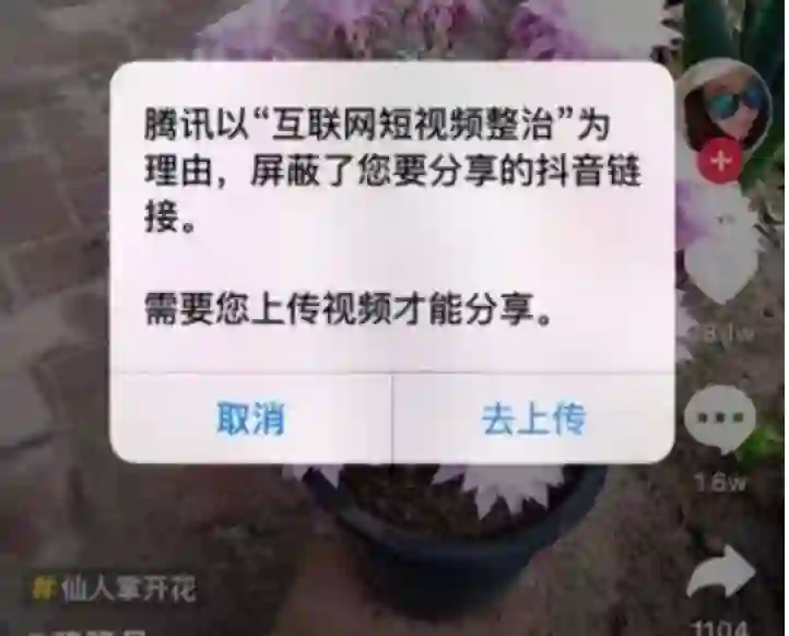 后面腾讯展开“互联网短视频整治”活动,开始全面在微信里屏蔽抖音短视频。抖音的视频链接无法正常分享给微信好友。