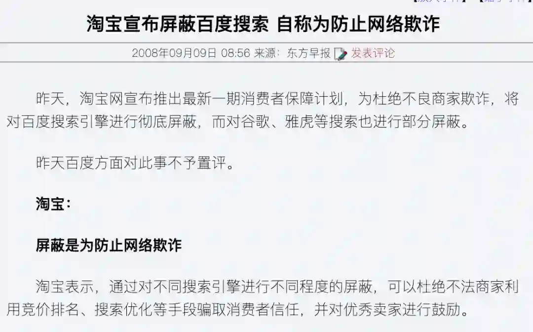 2008年9月8日,淘宝宣布屏蔽百度爬虫,也就是说百度的搜索结果里不会出现淘宝内页的商品。