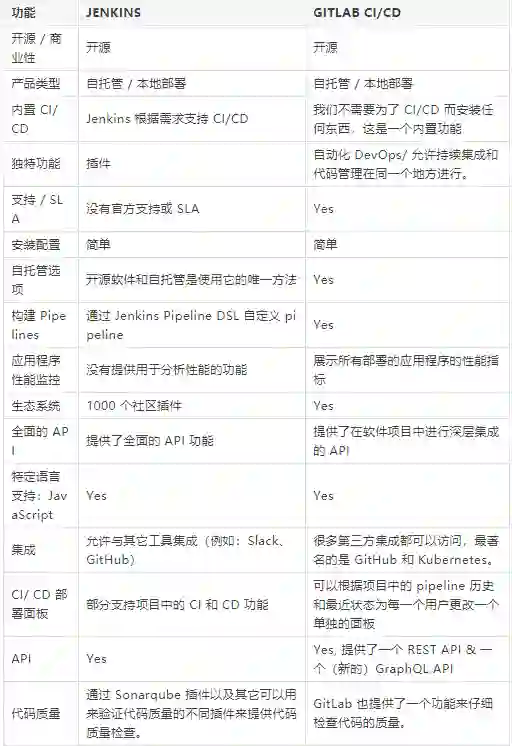 Jenkins 和 GitLab CI/CD 都有它们非常擅长的领域和各自的技术追随者。然而,在讨论 Jenkins vs GitLab CI/CD 之争时,会讨论许多功能。下图是这两个 CI/CD 工具提供的所有功能的比较。
