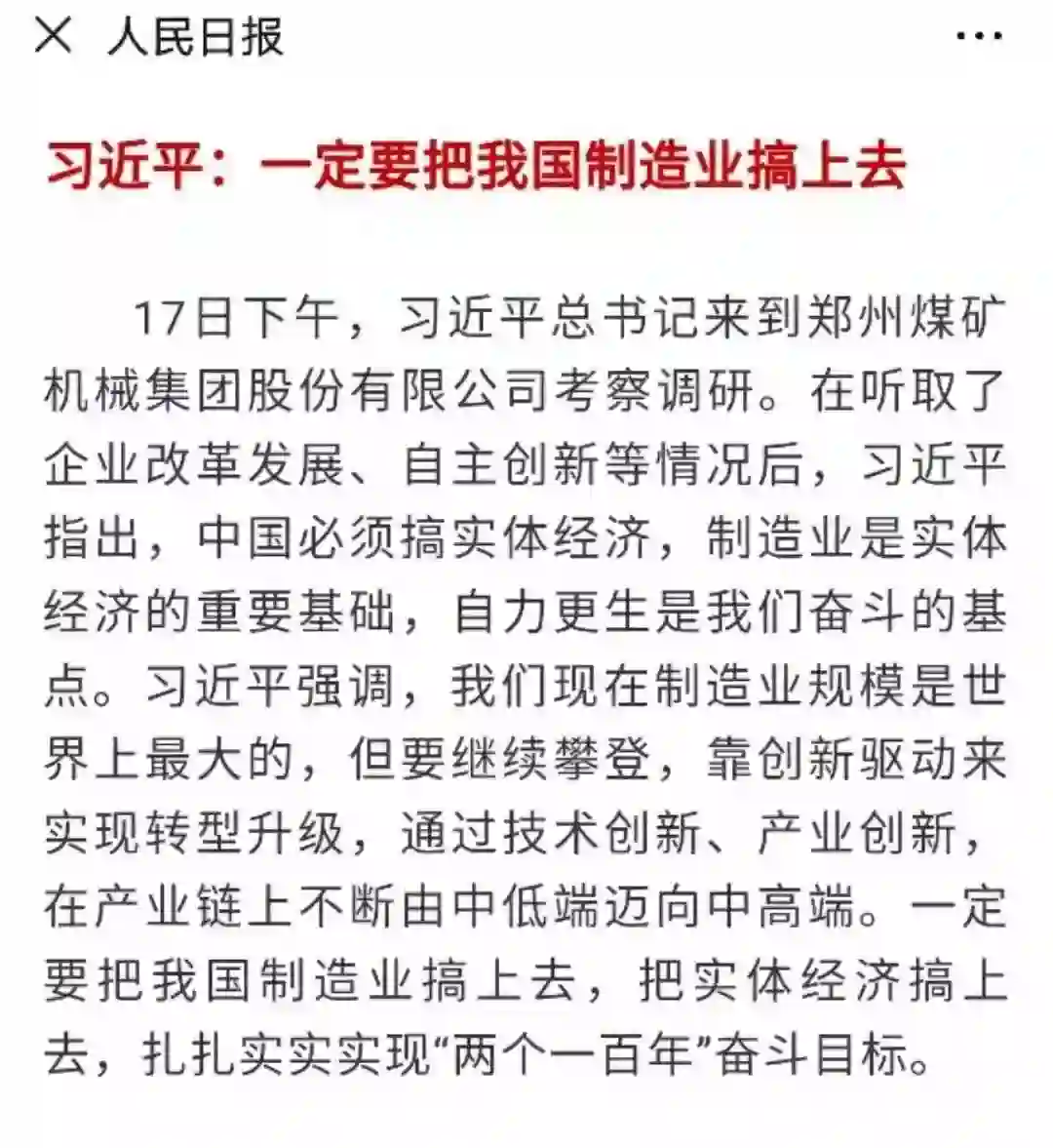 昨天人民日报发表社论称“一定要把我国制造业搞上去”。