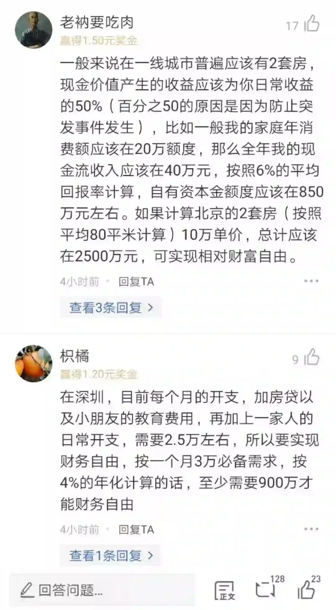 在球友的答案中,我们就可以看到各式各样的答案,有觉得600万就自由的,也有觉得900万,2500万,甚至5000万才自由的,这都是每个人真实的反应。